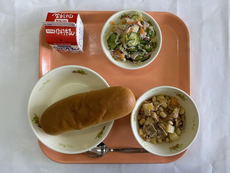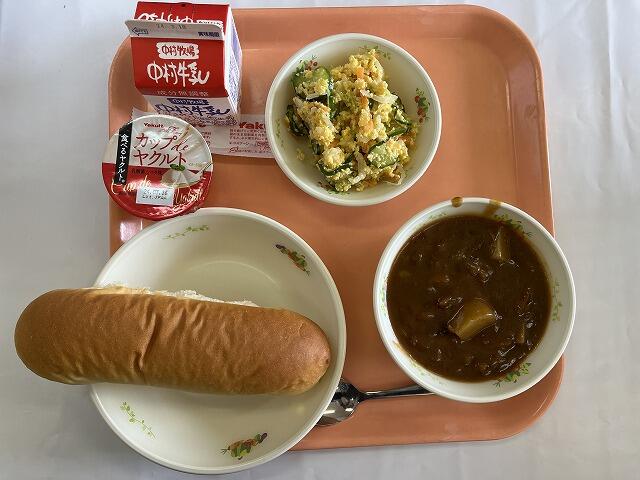ミルクパン ビーフシチュー ミモザサラダ ヤクルトデザート 牛乳