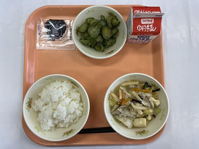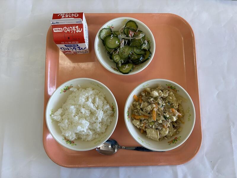 ごはん 厚揚げの中華煮 きゅうりのかっぱ漬け 1食しそ味ひじき 牛乳