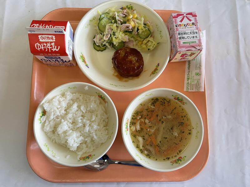ごはん ハンバーグ コーンサラダ ポテトスープ お祝いケーキ 牛乳
