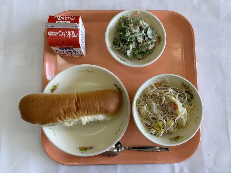 ミルクパン ビーフン炒め アスパラのツナサラダ 牛乳