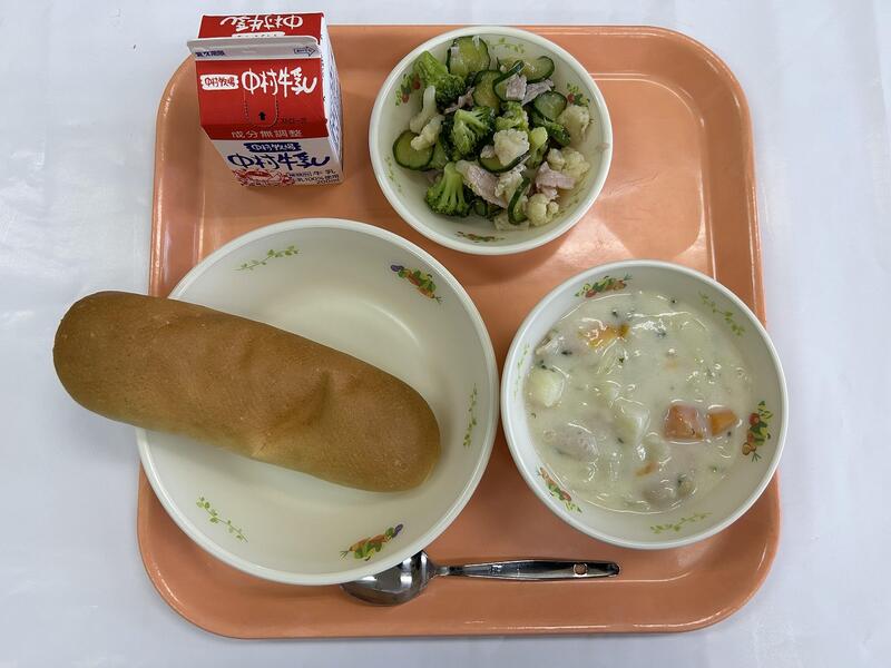 米粉パン クリームシチュー グリーンサラダ 牛乳