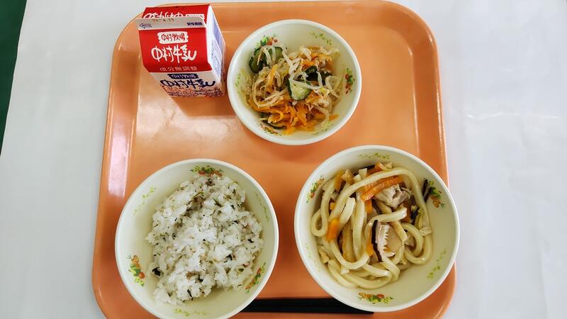 減量梅菜ご飯 五目うどん もやしのごま酢和え 牛乳