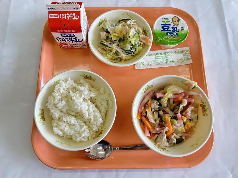 中華丼 春雨サラダ 豆乳ムース 牛乳