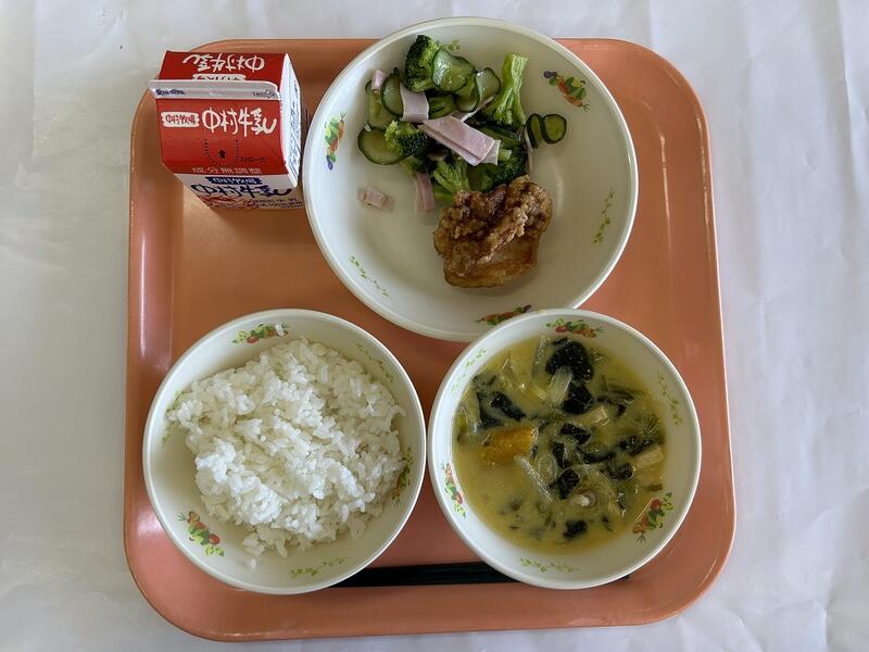ご飯 唐揚げ 添え野菜 豆乳味噌汁 牛乳