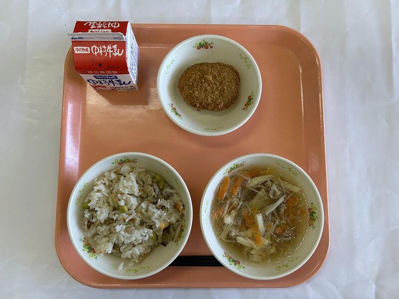 鶏ごぼうご飯 五目汁 コロッケ 牛乳