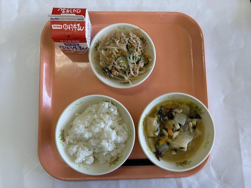ご飯 厚揚げの中華煮 もやしのごま酢和え 牛乳