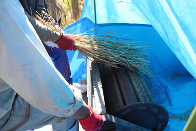 10月25日(火)午後、脱穀体験をしました。3週間前に刈ってほしておいた稲を、足踏み脱穀機を使って脱穀していきました。足踏みですが、とてもきれいに籾が取れていきました。子どもたちも、3回~4回ほど脱穀に挑戦しました。今日脱穀したもち米は、これから乾燥させて、12月にあるもちつきに使用する予定です。もちつきがとても楽しみになりました。