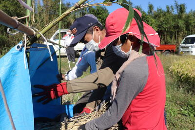 10月4日(火)天気もよく全校で稲刈りを行いました。今年は大きな台風によって稲が水に浸かるという不幸にみまわれましたが、10月3日にふもとっ子を伸ばす会の皆様方や保護者の方々の協力もあり、倒れた稲も無事に刈りやすい状態にしました。今日の稲刈り体験では、子どもたちは大人のレクチャーを受けながら稲を刈ったり、稲を運んだりと、楽しく活動していたので、良かったです。