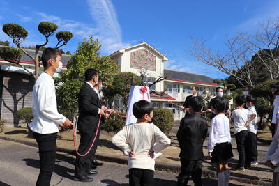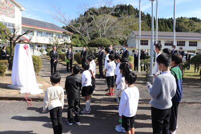 150周年記念式典後に記念碑前で除幕式を行いました。除幕式にもたくさんの来賓の方が出席され、感謝の気持ちでいっぱいです。除幕式では、地域を代表して前田地域公民館館長の花房様に挨拶をいただきました。そして、3名の来賓(市長、教育長、地域公民館館長)の方々と、実行委員長、校長、児童の6名で除幕を行いました。150周年を記念して作った記念碑の表は、今年在校している19名の児童に文字を書いてもらいました。裏は、150年の歴史が分かる写真や資料を載せています。除幕式後たくさんの方々が写真をとってらっしゃいました。皆さんの心にいつまでも残る記念碑になることを願っています。