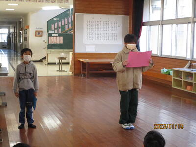 1月10(火)に、3学期がスタートしました。朝の登校から元気のよい子どもたちの挨拶が聞こえてきました。1時間目に始業式がありました。2年の帆純さんと5年の愛哩依さんが、3学期頑張ることについて発表をしました。3学期は約50日しかない短い学期ですが、まとめの時期であったり次の学年の準備の時期でもある大切な学期です。発表してくれた2人のように、目標をしっかりとたて、その目標を達成するために日々の学習や生活を頑張ってほしいと思います。