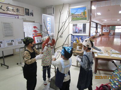 1月13日(金)に、地域の方の御協力をいただきながら全校で「めの餅づくり」をしました。地域の方に4色の餅をつくっていただき、榎の木に花のようにさしていきました。めの餅は、五穀豊穣、家内安全を祈願して行われる小正月の伝統行事です。令和5年度も、みんなが元気に明るく学校生活を過ごせればと思います。