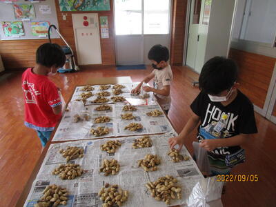 春に地域の方が落花生の苗を植えてくださり、それが大きくなり、たくさんの実をつけました。先週2年生の子どもたちがその落花生を収穫し、きれいに洗って全校の子どもたちや職員に配りました。粒がとても大きく、食べるのがとても楽しみな落花生でした。