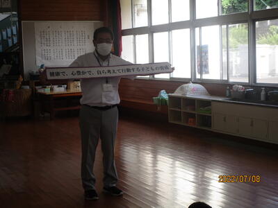 7月8日(金)の朝に全校朝会がありました。今回は、3人の先生に話をしていただきました。校長先生は、学校目標である「心豊かで自ら考えて行動する」ことができていた栗巣地区の子どもたちがゴミ拾いをしながら登校することを全校の前で紹介しました。図書担当の先生は、夏休みの本の貸し出しに向けてお薦めの本を紹介しました。養護教諭の先生は、コロナの感染症対策について改めて子どもたちと確認をしました。子どもたちは、みんな真剣に3名の先生方の話を聞いていました。