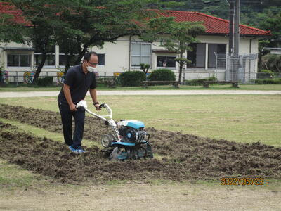 運動場のトラックは、50メートルの直線がとれないので、毎年体力テストの時期にはフィールドの中に走るレーンをとっていました。しかし、フィールド内には芝生の部分があり、子どもたちがとても走りにくそうでした。そこで、PTAに相談したところ、機械をもってきてくださり、芝生を取り除いてくださいました。今年は、子どもたちも思いっきり走ることができると思います。ありがとうございました。