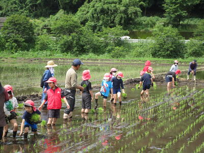 6月9日(金)の2~4校時に全校で田植えをしました。今年は、前日の大雨のためか去年より土が軟らかく、子どもたちも泥に足をとられて、植えにくそうでした。しかし、地域支援ボランティアの『ふもとっ子を伸ばす会』の方々や保護者の協力で上手に植えることができました。これから夏に向けて稲は分けつし、生長していきます。水の管理、草刈り、肥料やりなど、ふもとっ子を伸ばす会の方々やPTAの協力をもらいながら、子どもたちと稲の生長を見届けていきたいと思います。