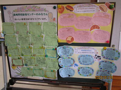 全国学校給食週間に合わせて、高崎麓小学校では、児童に分かりやすい給食の歴史等について掲示したり、感謝のお手紙をお世話になっている方々に書いたりしました。年代別の給食サンプルを見て、子どもたちは「鯨のお肉を食べてみたいな。」「今の給食が一番豪華だね。」など、給食に関して今まで以上に興味をもったようでした。