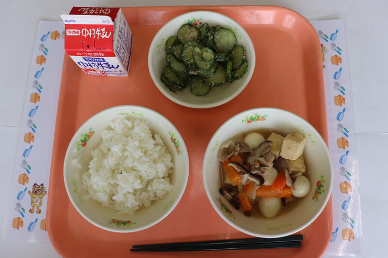 ごはん、厚揚げの中華煮、きゅうりの中華漬け、牛乳