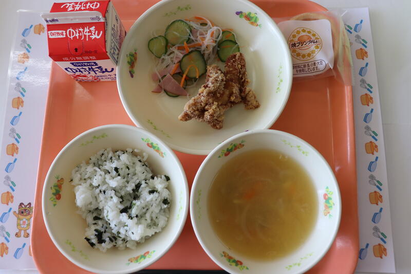 高崎小リクエストメニュー(減量わかめごはん、からあげ、春雨サラダ、コーンスープ、プリンタルト、牛乳)