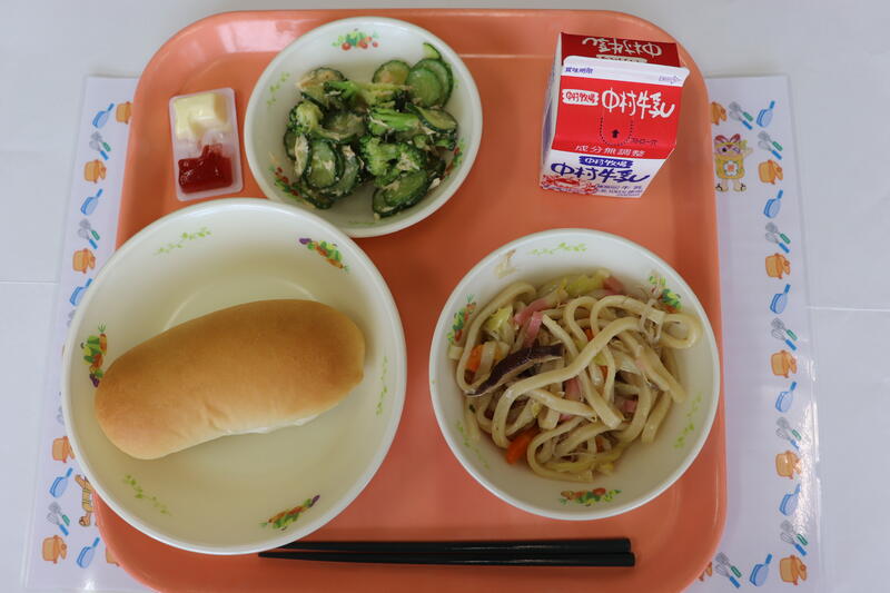 減量コッペパン、1食いちごマーガリンジャム、焼うどん、グリーンサラダ、牛乳