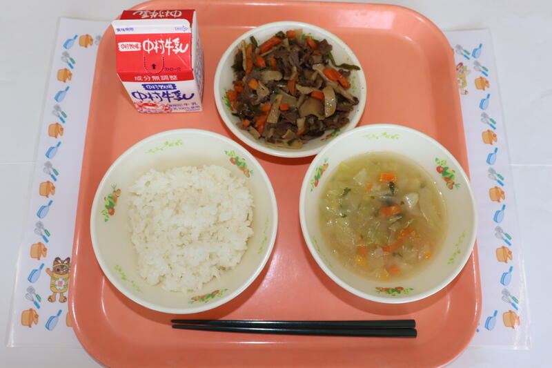 ごはん、宮崎牛のチンジャオロース、中華スープ、牛乳