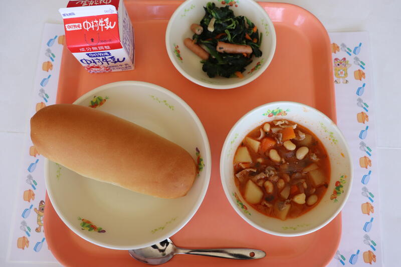 コッペパン、ポークビーンズ、ほうれん草のソテー、牛乳