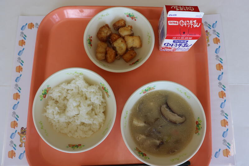 ごはん、県産真鯛の塩唐揚げ、野菜のゴマ汁、牛乳