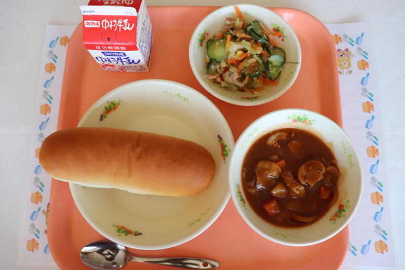 ミルクパン、ポークシチュー、元気もりもりサラダ、牛乳