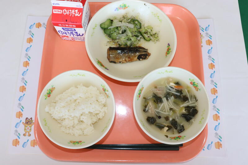 ごはん、さんまのみぞれ煮、ゆかり和え、小松菜の味噌汁、牛乳