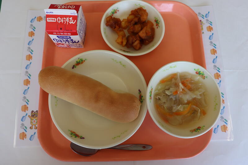 米粉パン、鶏肉のオーロラ和え、マロニーのスープ、牛乳