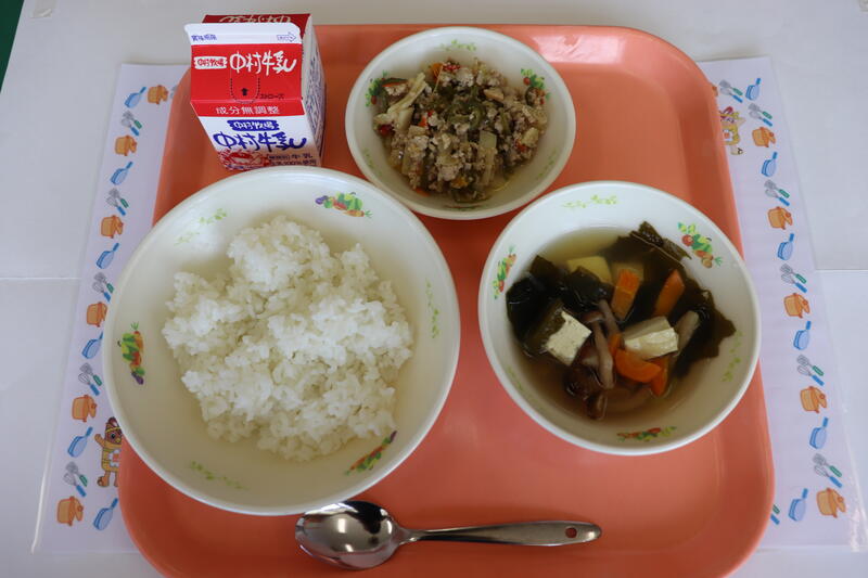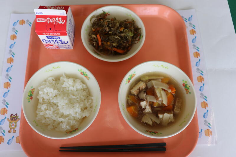 ごはん、豚肉と刻み昆布の炒め物、五目汁、牛乳