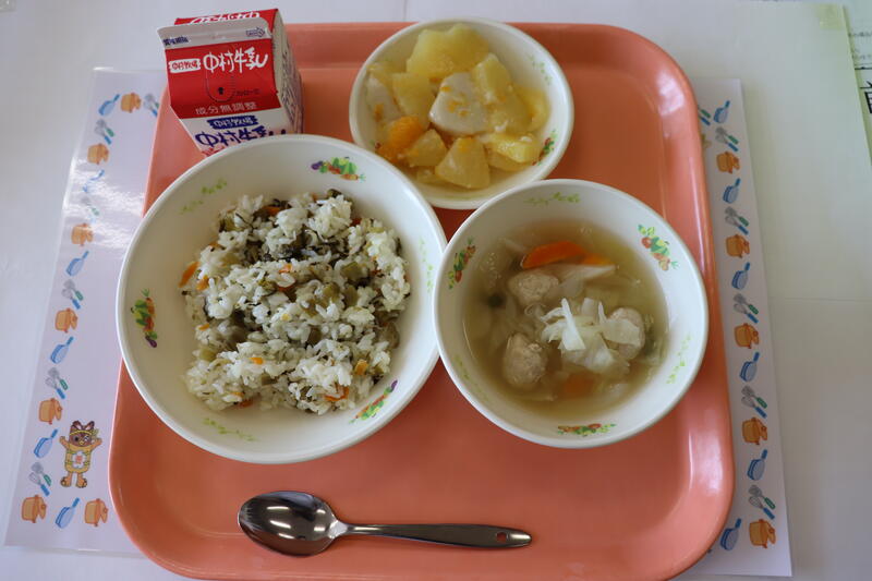 高菜とじゃこのピラフ、肉団子スープ、フルーツ豆乳、牛乳