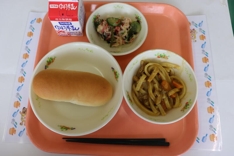 減量コッペパン、カレーうどん、海藻サラダ、牛乳