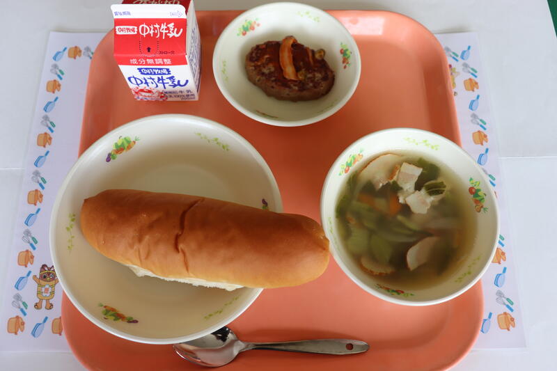 ミルクパン、きのこソースハンバーグ、チンゲン菜のスープ、牛乳