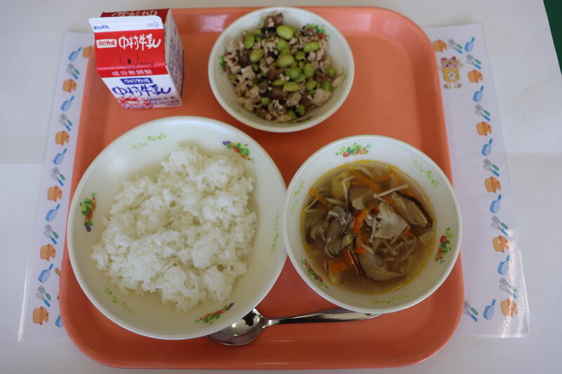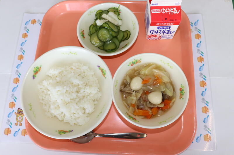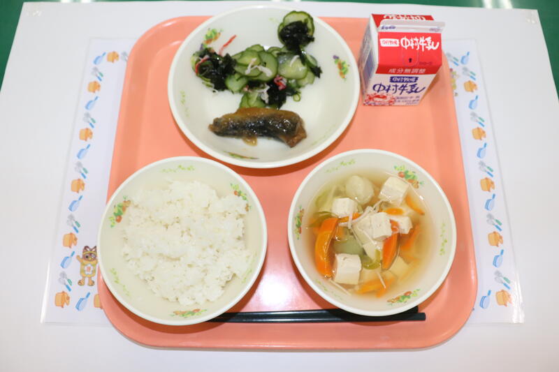 ごはん、イワシのみぞれ煮、きゅうりとわかめの酢の物、すまし汁、牛乳