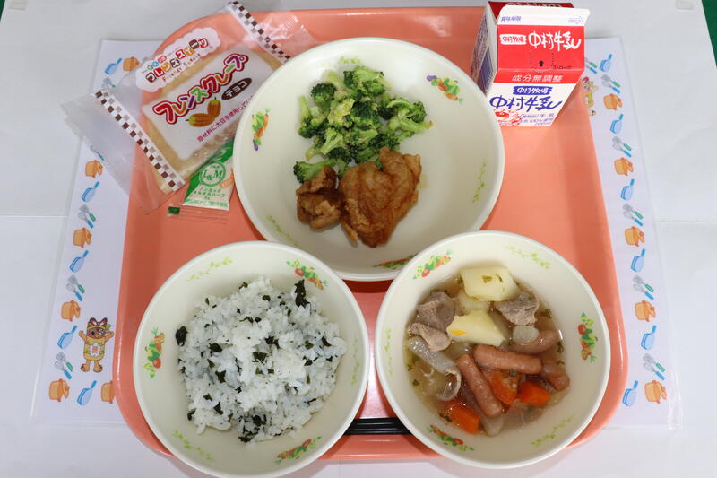 江平小学校リクエストメニュー(減量わかめごはん、チキン南蛮、1食タルタルソース、添え野菜、ポトフ、チョコクレープ、牛乳)