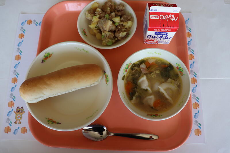 米粉パン、鶏肉とさつまいもの味噌絡め、プチ餃子スープ、牛乳