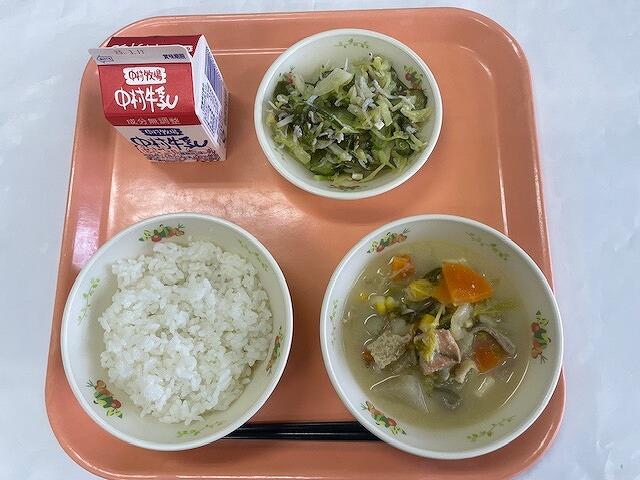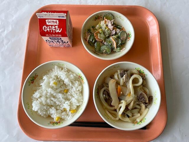 減量コーンご飯 肉うどん 白菜のマヨネーズ和え 牛乳