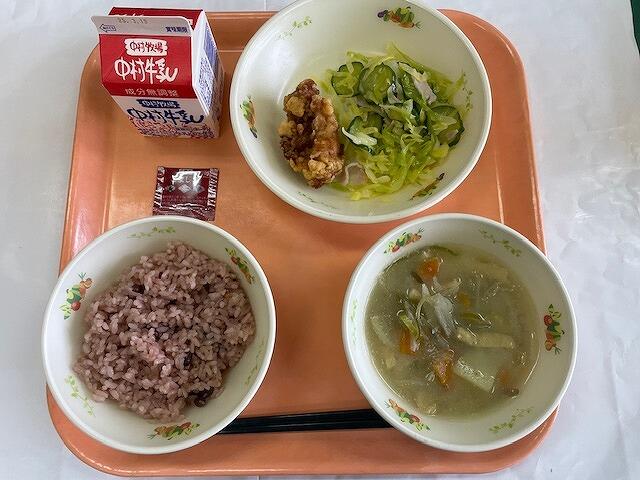 せきはん 野菜のごま汁 からあげ サラダ ごま塩 牛乳