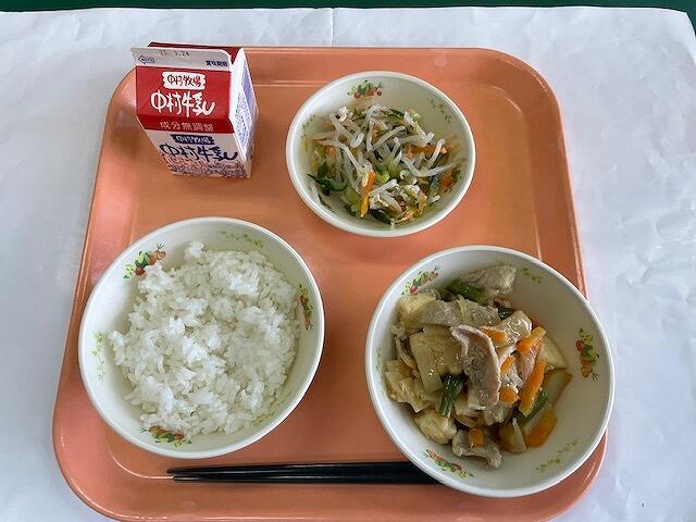 ご飯 豚肉と大根のうま煮 もやしのごま酢和え 牛乳