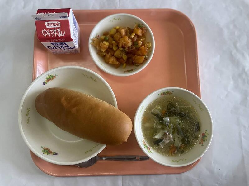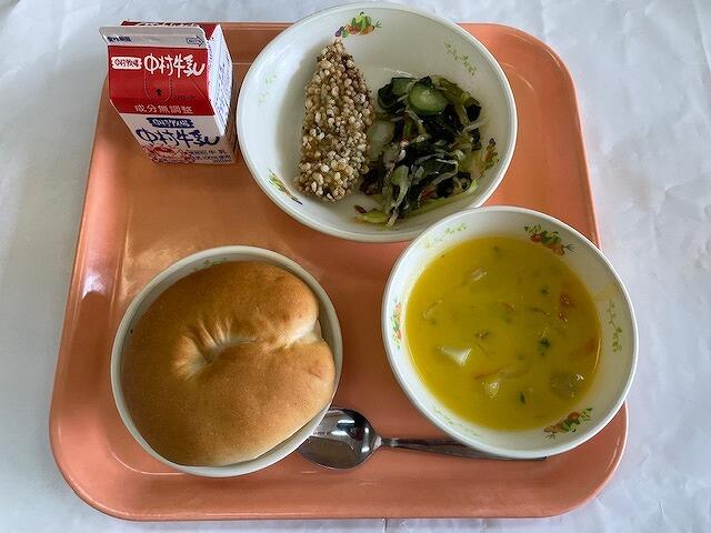 まるコッペパン 南瓜のポタージュ ホキてんたまあげ 海藻サラダ 牛乳