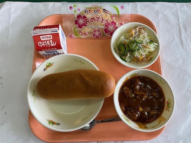 黒糖パン ミートボールシチュー はるさめサラダ お祝いクレープ 牛乳