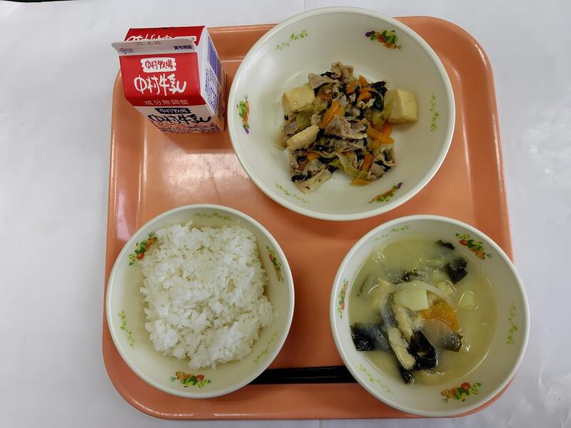 ご飯 じゃがいもの味噌汁 豚肉と野菜の炒め物 牛乳