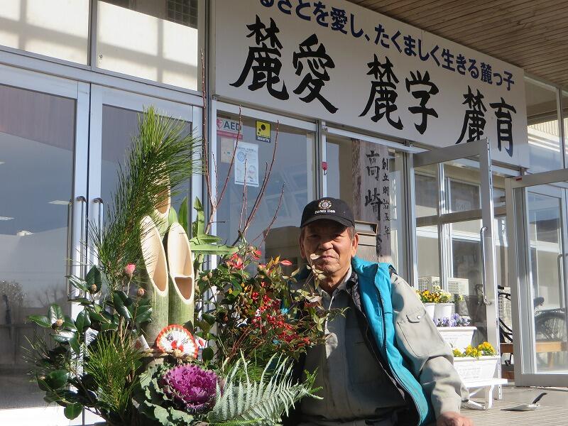 今日、学校玄関に門松を飾りました。地域在住の藤田二夫さんに造っていただきました。立派な門松が完成しました。後日、しめなわも飾る予定です。