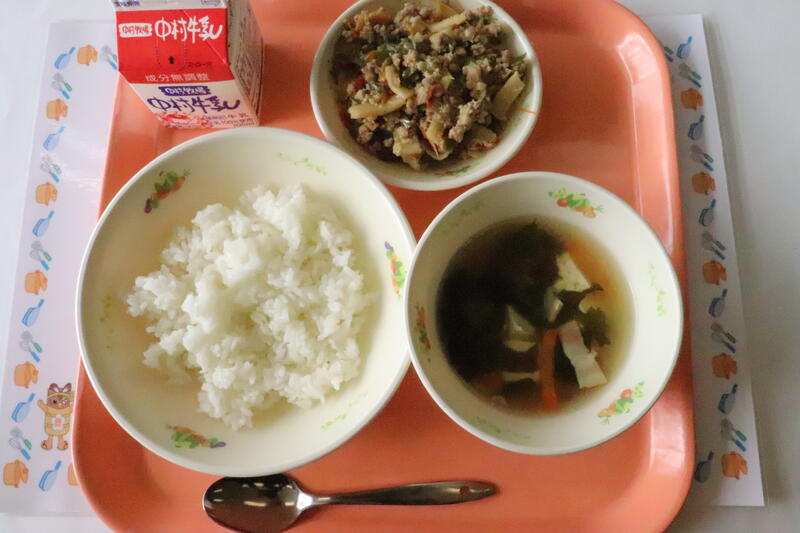 アーモンドとピーマンの肉みそ丼、わかめスープ、牛乳