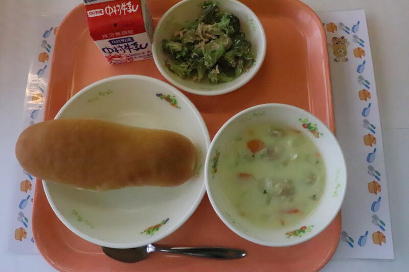 コッペパン、鶏肉のエスニカンシチュー、ブロッコリーサラダ、牛乳