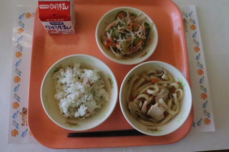 減量赤かぶ青菜飯、かしわうどん、もやしのゴマ酢和え、牛乳