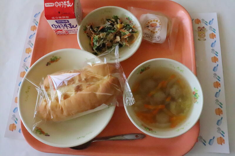 コッペパン、1食蜂蜜マーガリンジャム、タラチリソース、中華コーンスープ、牛乳