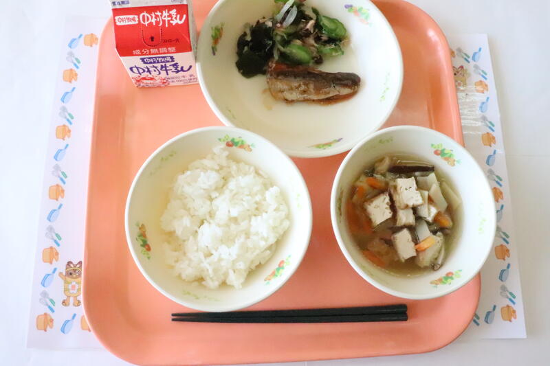 ごはん、イワシのトマト煮、海藻サラダ、五目汁、牛乳