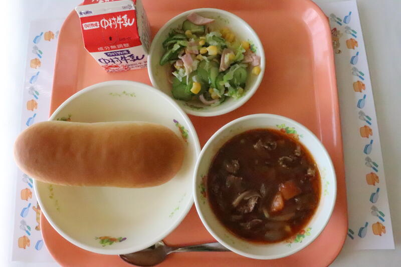 コッペパン、宮崎牛のビーフシチュー、コーンサラダ、牛乳