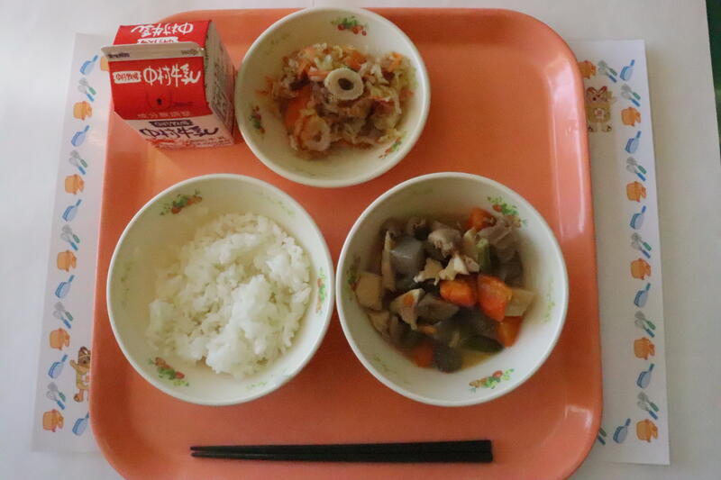 ごはん、じとっこカレー、千切り大根サラダ、牛乳